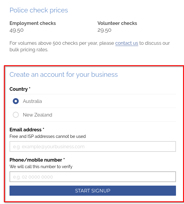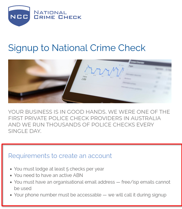 The signup process will allow you to create a National Crime Check user account for your business and set up everything you need to start requesting police checks.