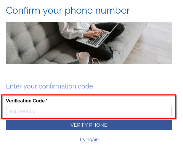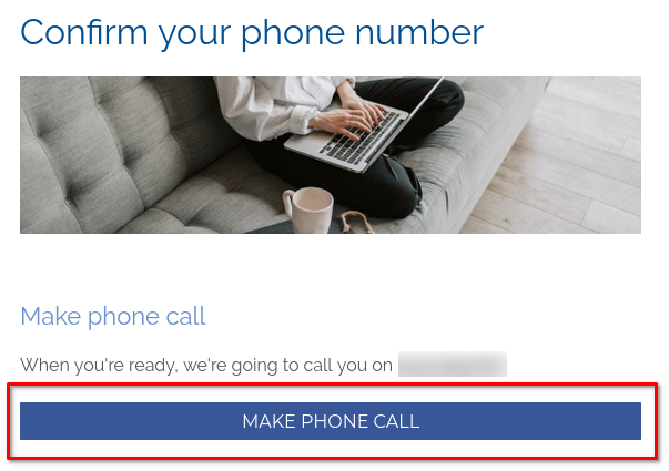 - Verify your phone numberWhen you are ready to receive a phone call, use the MAKE PHONE CALL button. Our system will make a call to the phone number written above the MAKE PHONE CALL button. A verification code will be read out to you.Enter the verification code that was read out to you into the field highlighted in the image above. Once you have entered the code, use the VERIFY PHONE button to continue.If there is an issue with the phone call, use the Try again link to start another phone call.