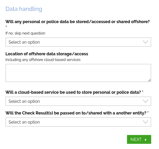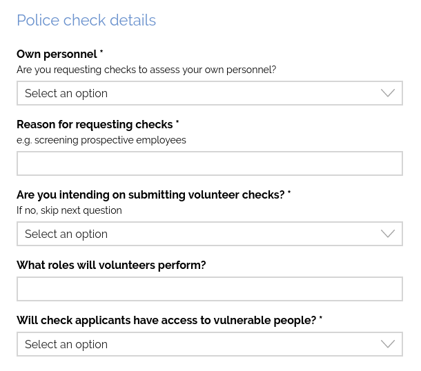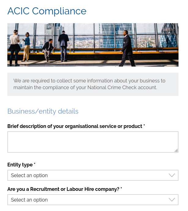 Due to the compliance requirements of ACIC, we need to ask a few questions about your business, the types of police checks you want to request, and how your business stores/handles data.