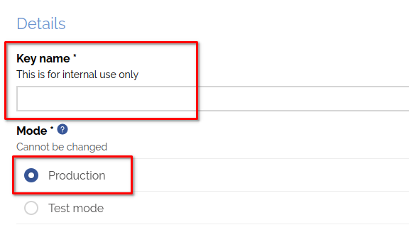 - Choose a name for your key and select the Production option
