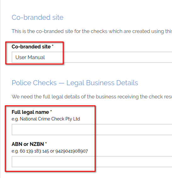 - Choose the co-branded site and supply legal business details