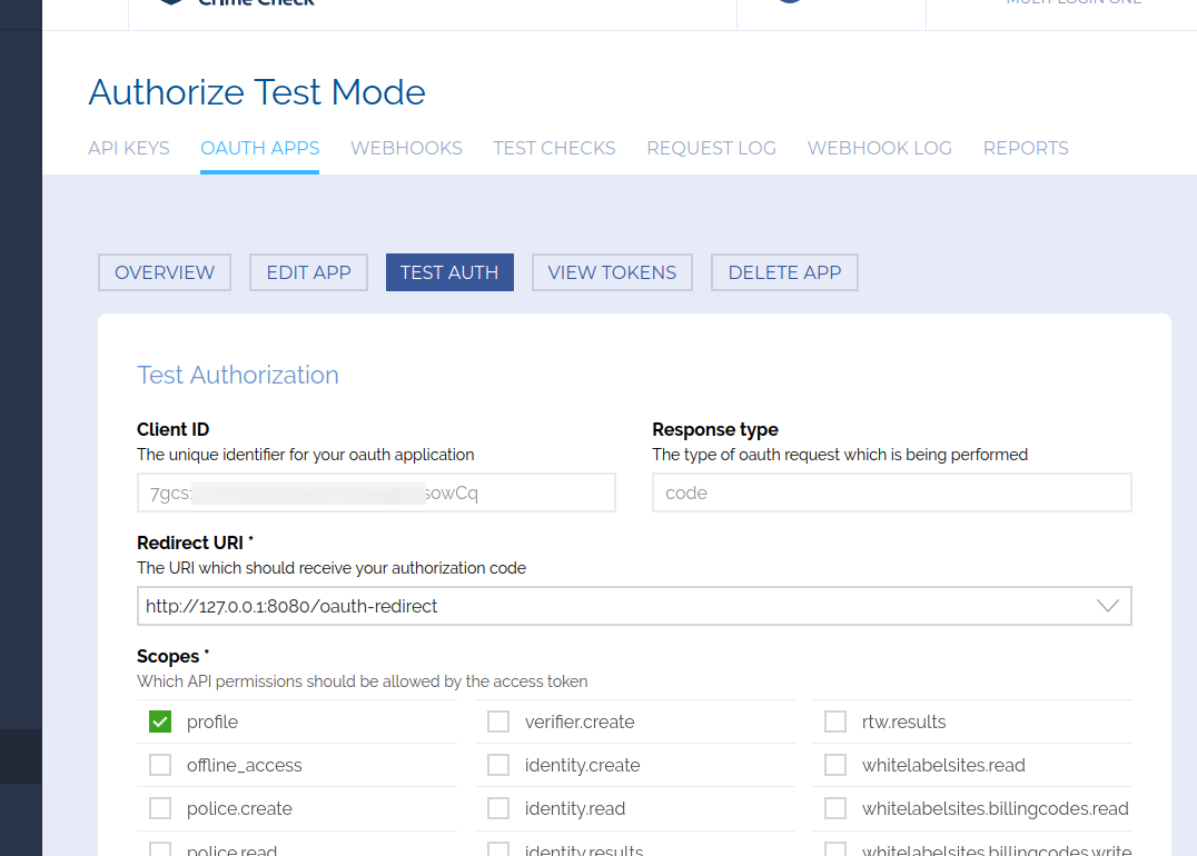 You can use the Test Auth tool to manually commence the Authentication Code oauth workflow. This can be used in test mode to assist with the development of your integration.