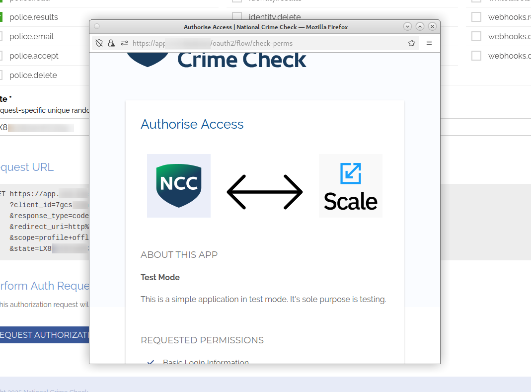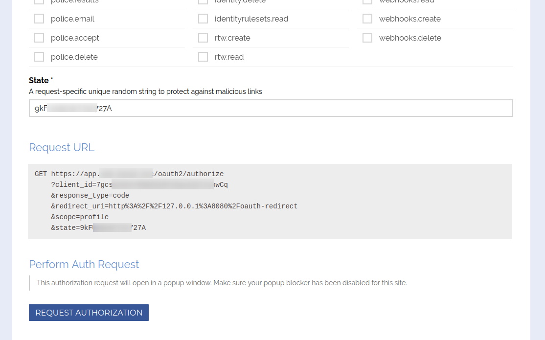 You can click the Request Authorization button to begin the oauth authorization code handshake. This opens in a popup window. You can also right click and choose to open in a new tab instead if desired.