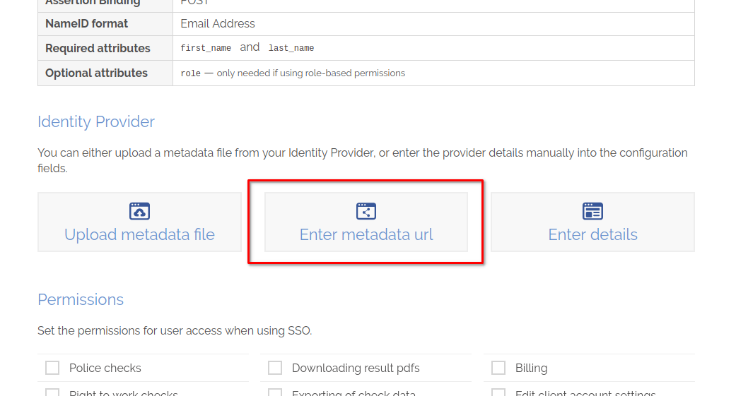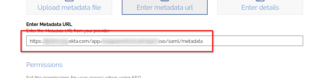 Identity provider details might be available as metadata file or as a metadata url or by entering the fields directly.