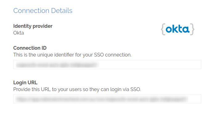 - SSO is now enabledSome basic details are shown at the top of the page. You can see the Connection ID and Identity Provider (Okta).