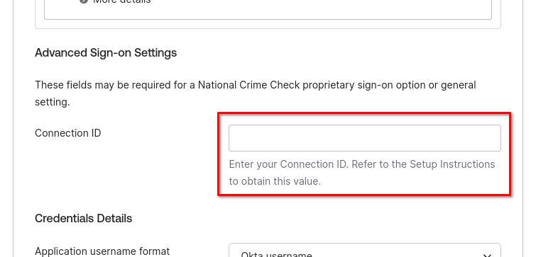 - Scroll down to the Advanced Sign-on Settings area and enter the Connection ID