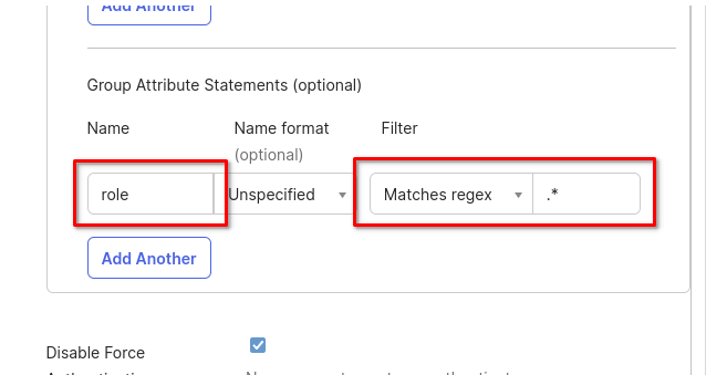 - Under group attribute statements enter "role" as the name, matches regex, and
