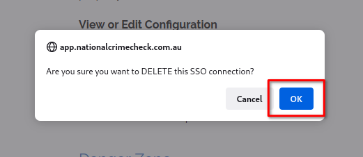 Confirm that you want to disable the SSO connection by clicking the