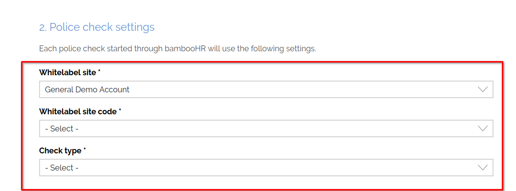 - Set up the police check settingsWhen the selected whitelabel site has at least one forced reason/place of work, you will need to select an option from the dropdown menus. All checks started through BambooHR will use the selected reason/place of work. When there is no forced reason/place of work set on the selected whitelabel site, the reason and place of work will be fetched from the BambooHR applicant record when the check is started.