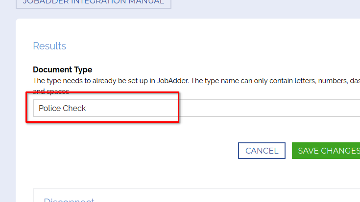- Enter the document type to use for results into the Document Type fieldThe document type must already exist within your JobAdder account.You can add a type within JobAdder by going to Account > Admin Settings then in the settings area go to Candidates > Document Types.Note that if your document type doesn't exist then you will see error messages in your integration log.