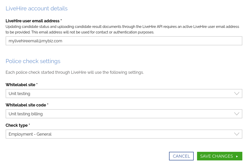 The Check purpose/reason and Place of work fields will not be visible if you have no forced reason or forced place of work set in your whitelabel settings. In this case, all checks started through this connection will use the reason and place of work supplied by the third party provider.