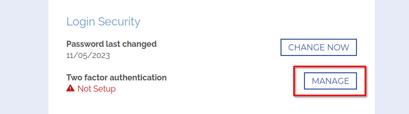 - From the preferences screen, in the Two Factor Authentication section, click the Manage button