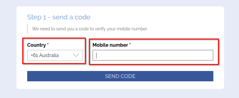 - Click the Send code buttonA six-digit code will be sent to your mobile. You will have two minutes to use this code.